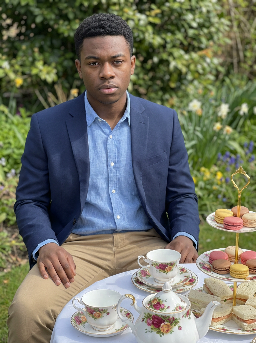 model at tea party setting, elegant china, spring treats, sophisticated casual outfit