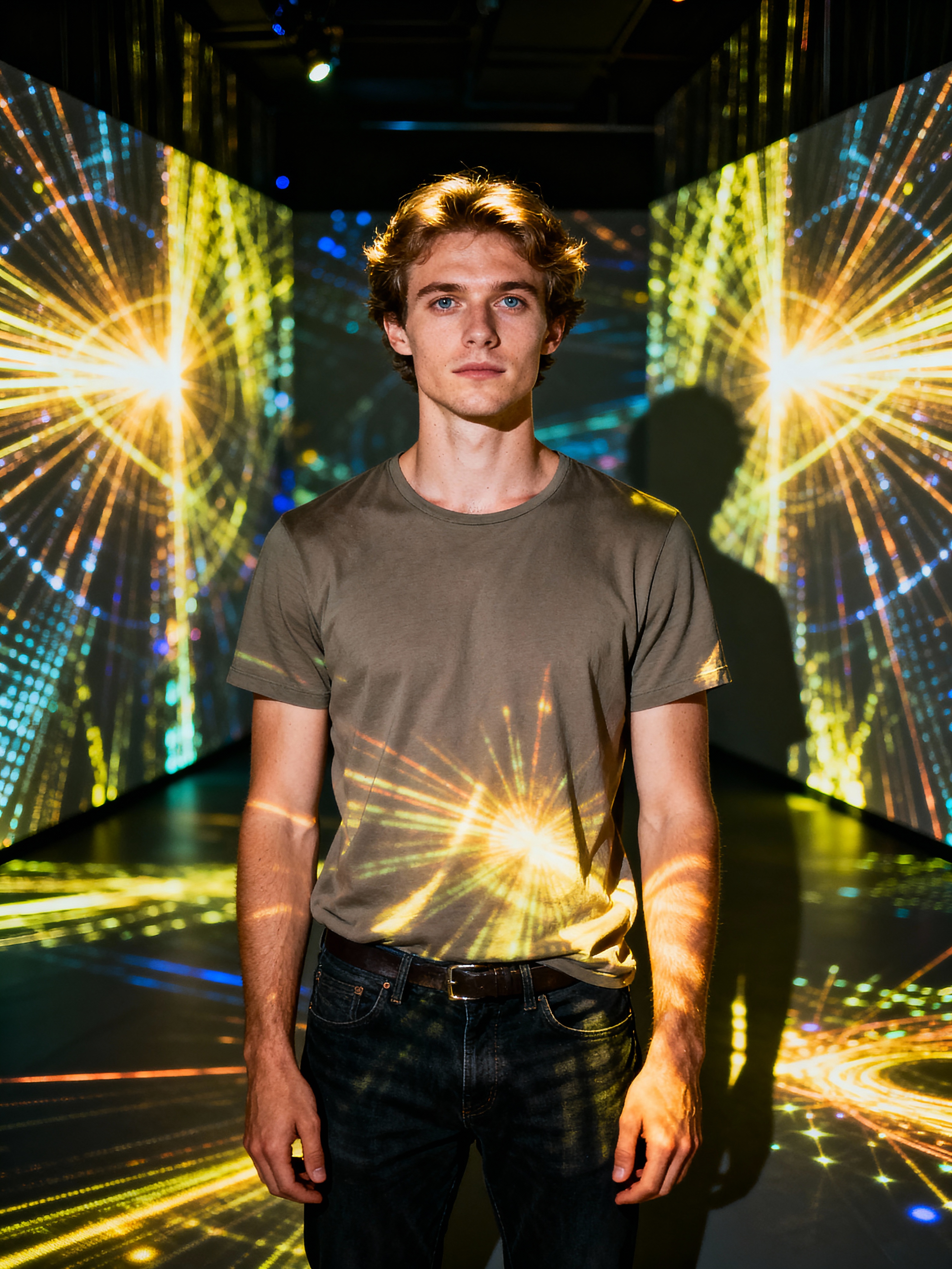 model at teamLab Borderless digital art museum, wearing dark jeans with a minimalist t-shirt, surrounded by digital light installations