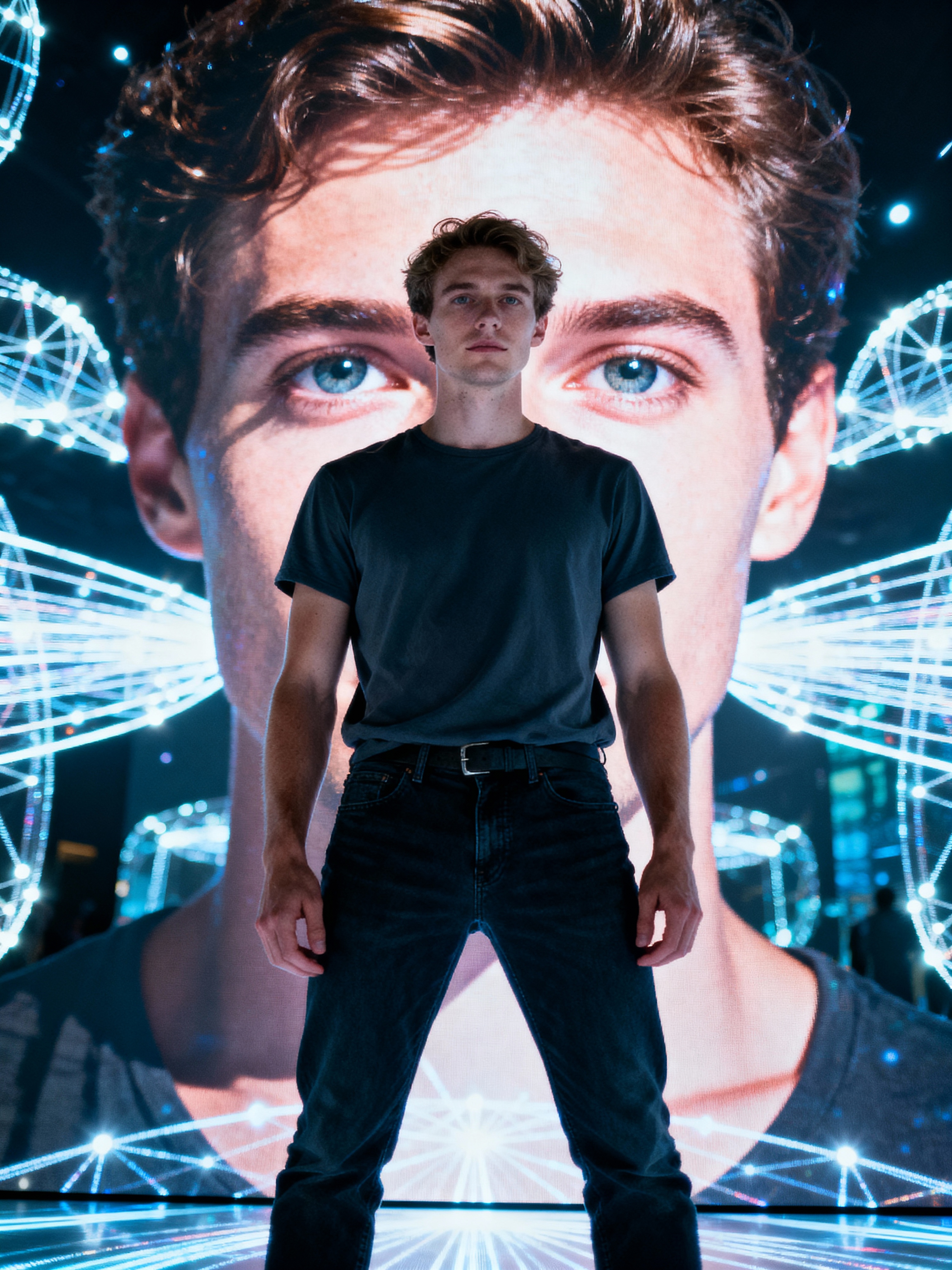 model at teamLab Borderless digital art museum, wearing dark jeans with a minimalist t-shirt, surrounded by digital light installations