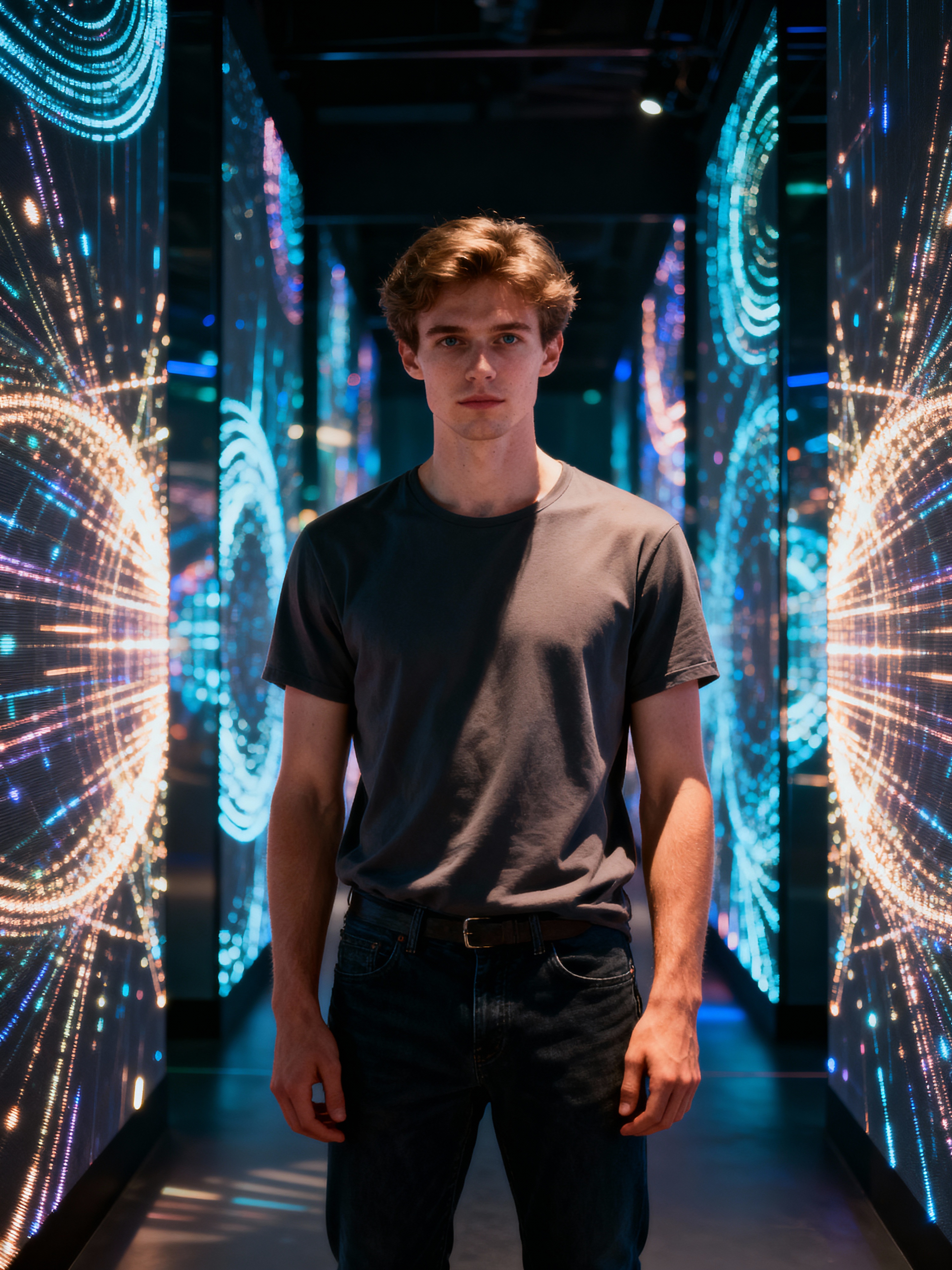 model at teamLab Borderless digital art museum, wearing dark jeans with a minimalist t-shirt, surrounded by digital light installations