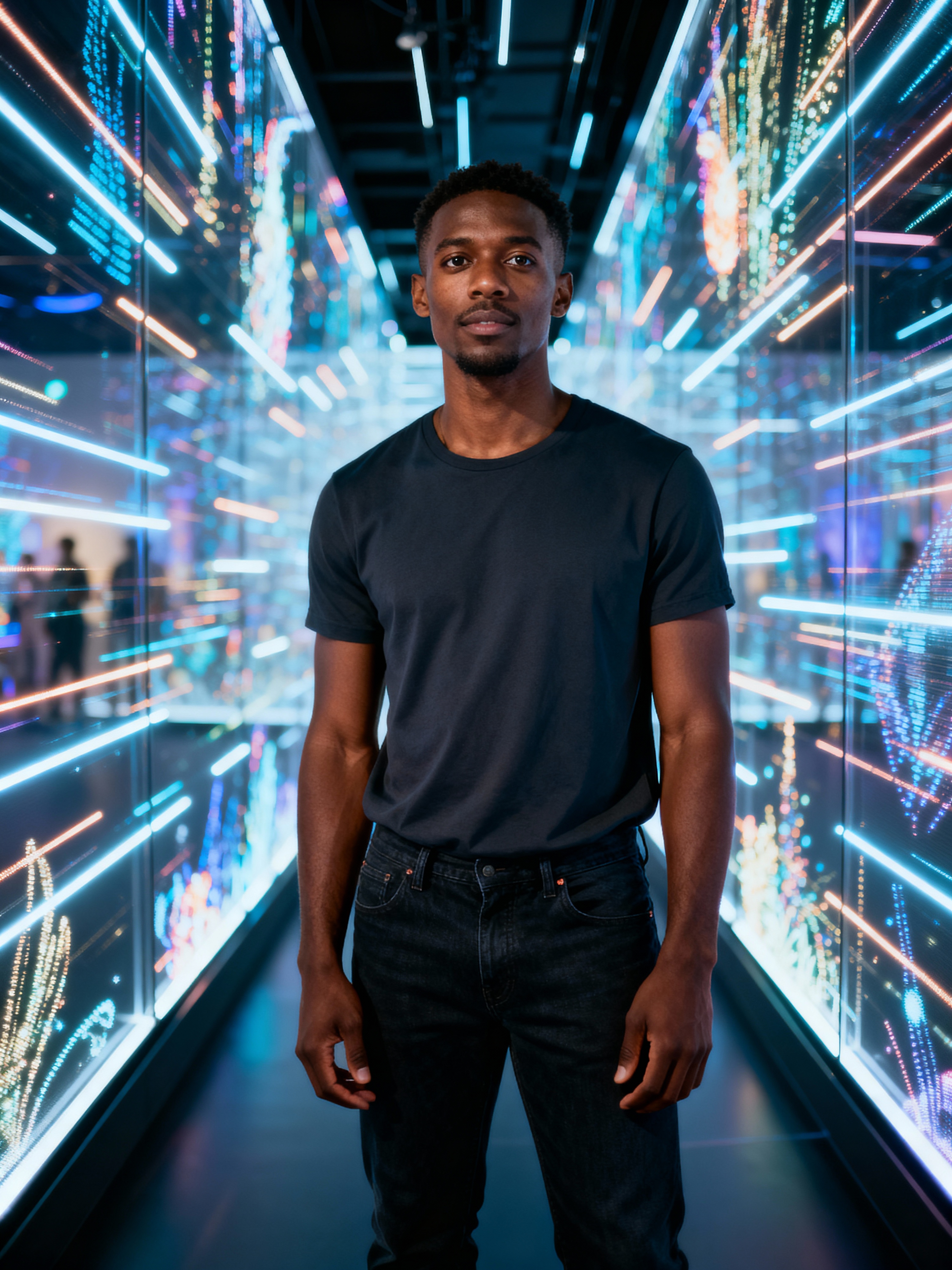 model at teamLab Borderless digital art museum, wearing dark jeans with a minimalist t-shirt, surrounded by digital light installations