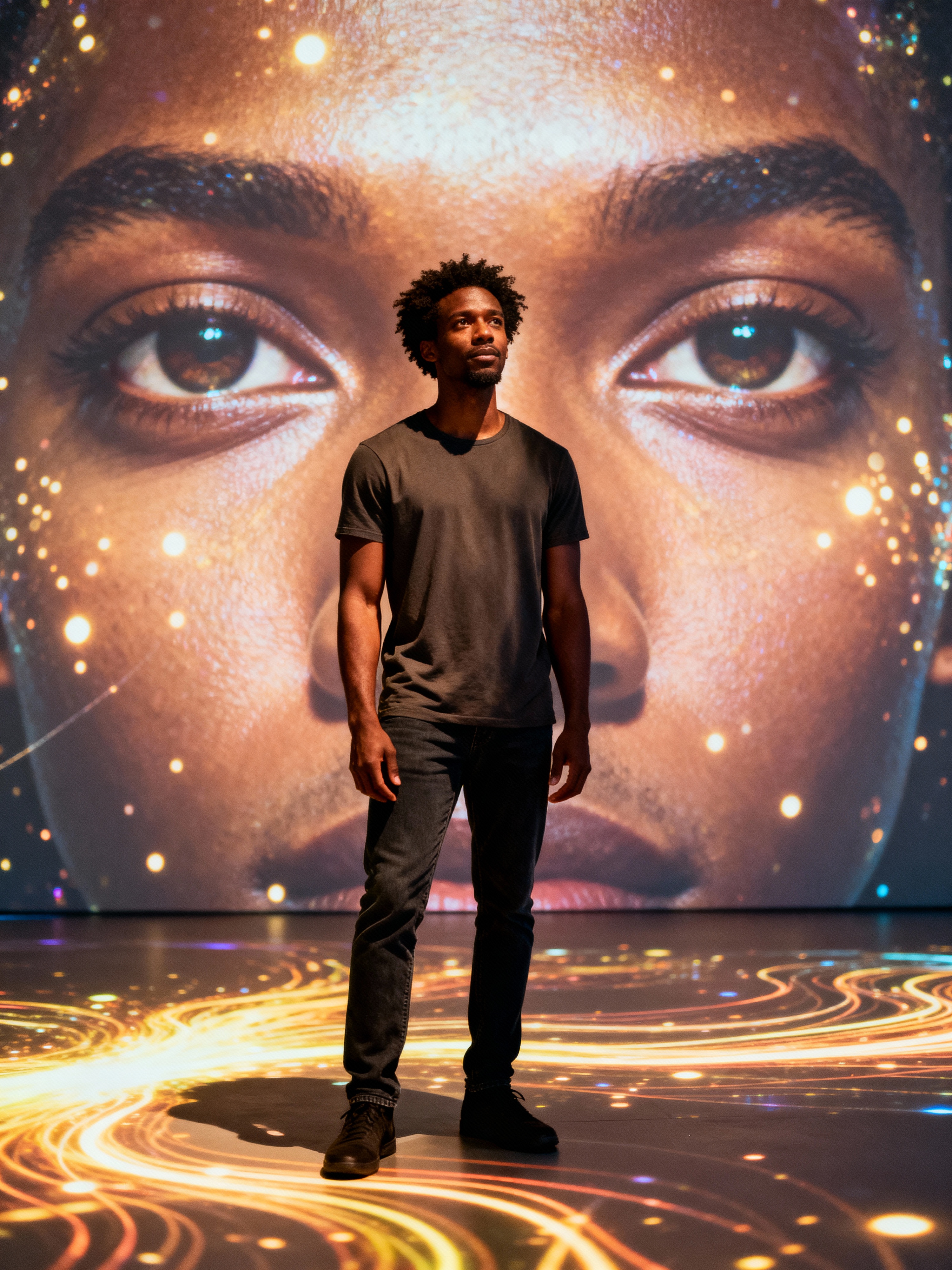 model at teamLab Borderless digital art museum, wearing dark jeans with a minimalist t-shirt, surrounded by digital light installations