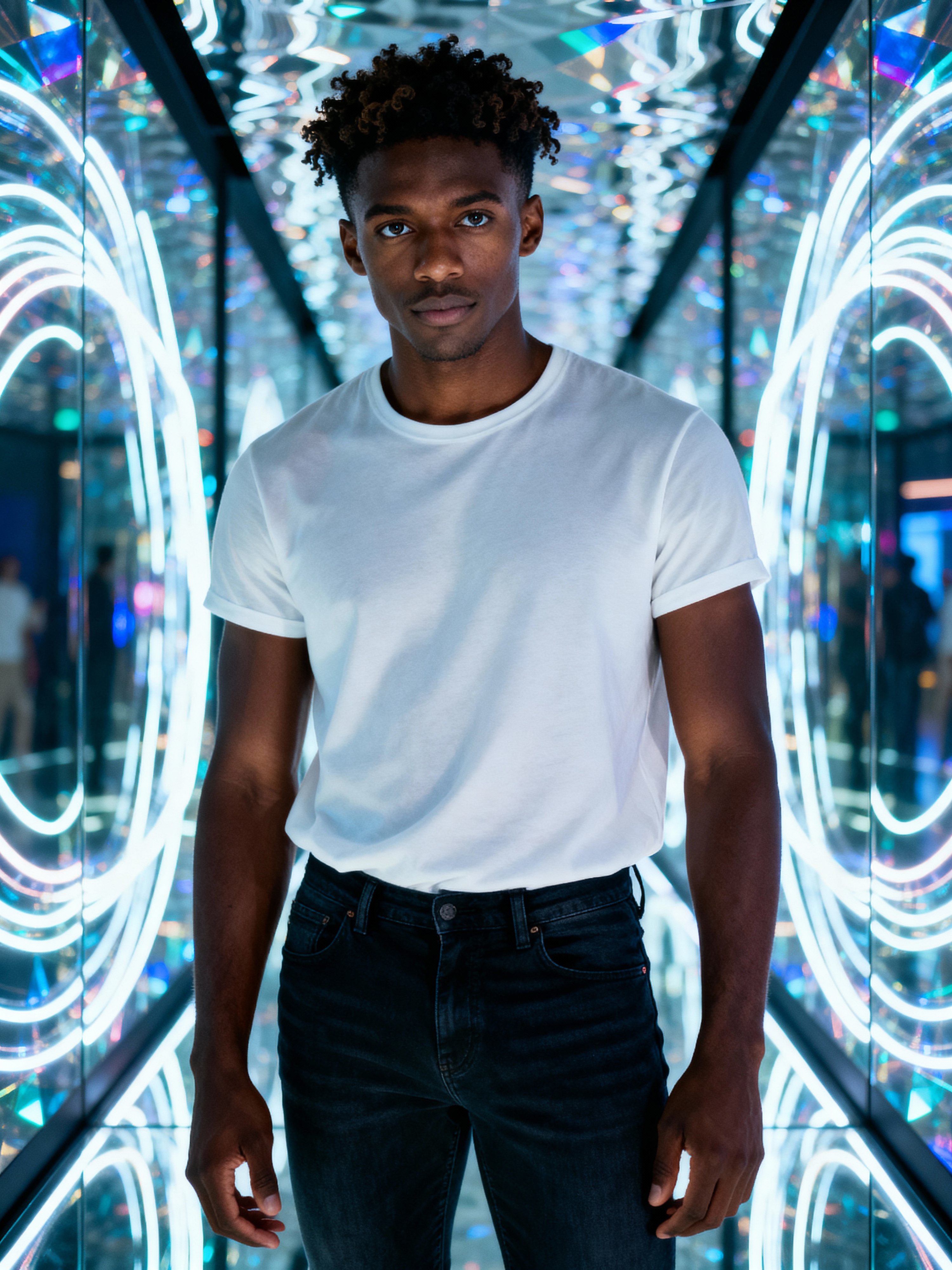 model at teamLab Borderless digital art museum, wearing dark jeans with a minimalist t-shirt, surrounded by digital light installations