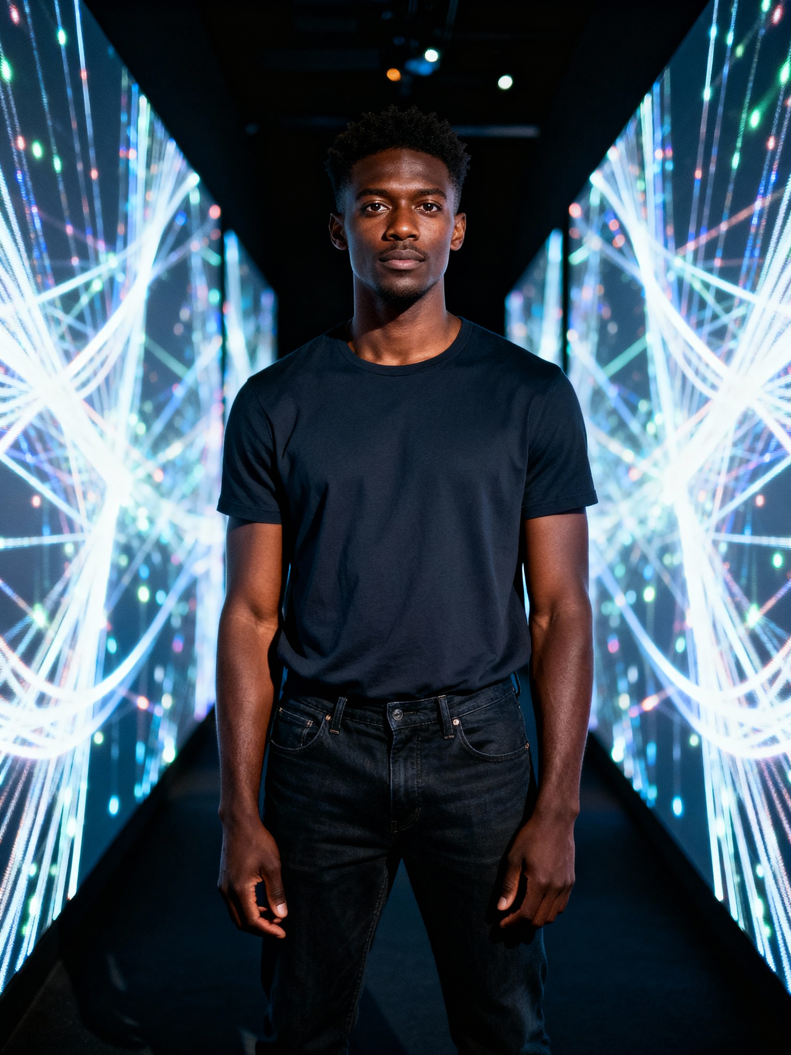model at teamLab Borderless digital art museum, wearing dark jeans with a minimalist t-shirt, surrounded by digital light installations
