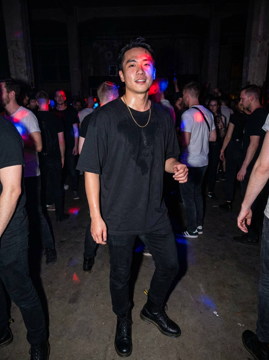model at techno party in Berghain night club in Berlin. at night. model wears black oversized t-shirt, gold chain, black jeans, and black combat boots