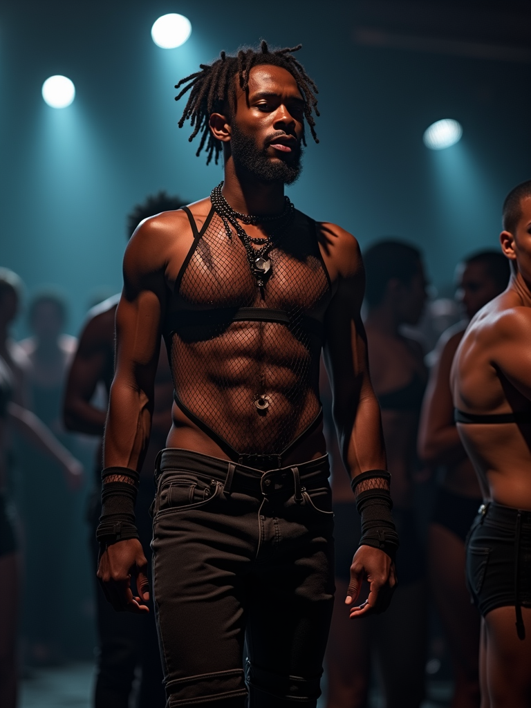 model at techno party in berghain night club in berlin. at night. the model wears fishnet top, black jeans fishnet stockings, black boots. garter straps, bdsm harness, garter belts