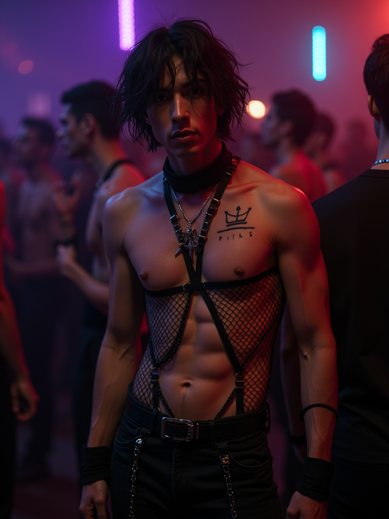 model at techno party in berghain night club in berlin. at night. the model wears fishnet top, black jeans fishnet stockings, black boots. garter straps, bdsm harness, garter belts