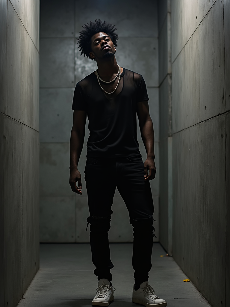 model at techno party in berghain night club in berlin. the night club has concrete walls and is very minimalist. at night. the model wears a black sheer top, black jeans, white sneakers