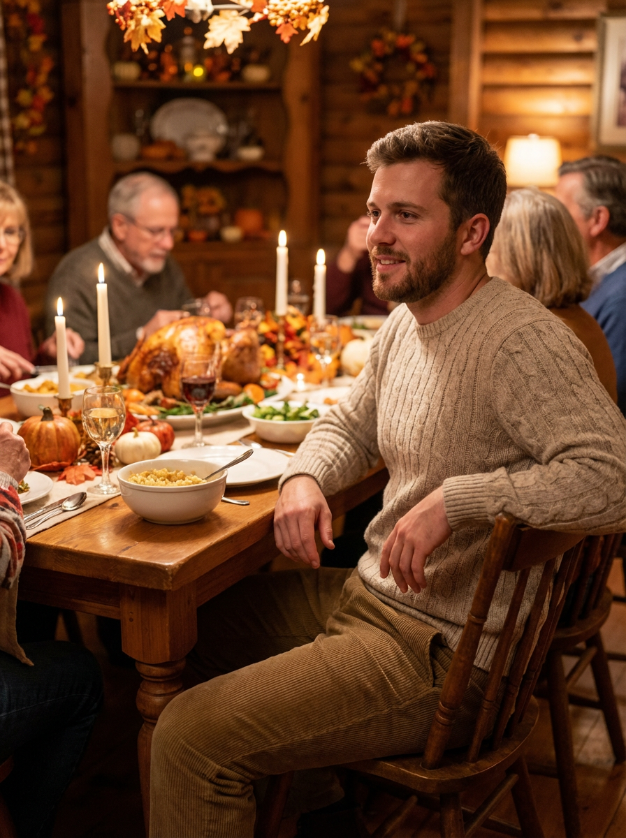 model at Thanksgiving dinner table, beautiful turkey centerpiece, warm candlelight, cozy fall outfit, family gathering atmosphere