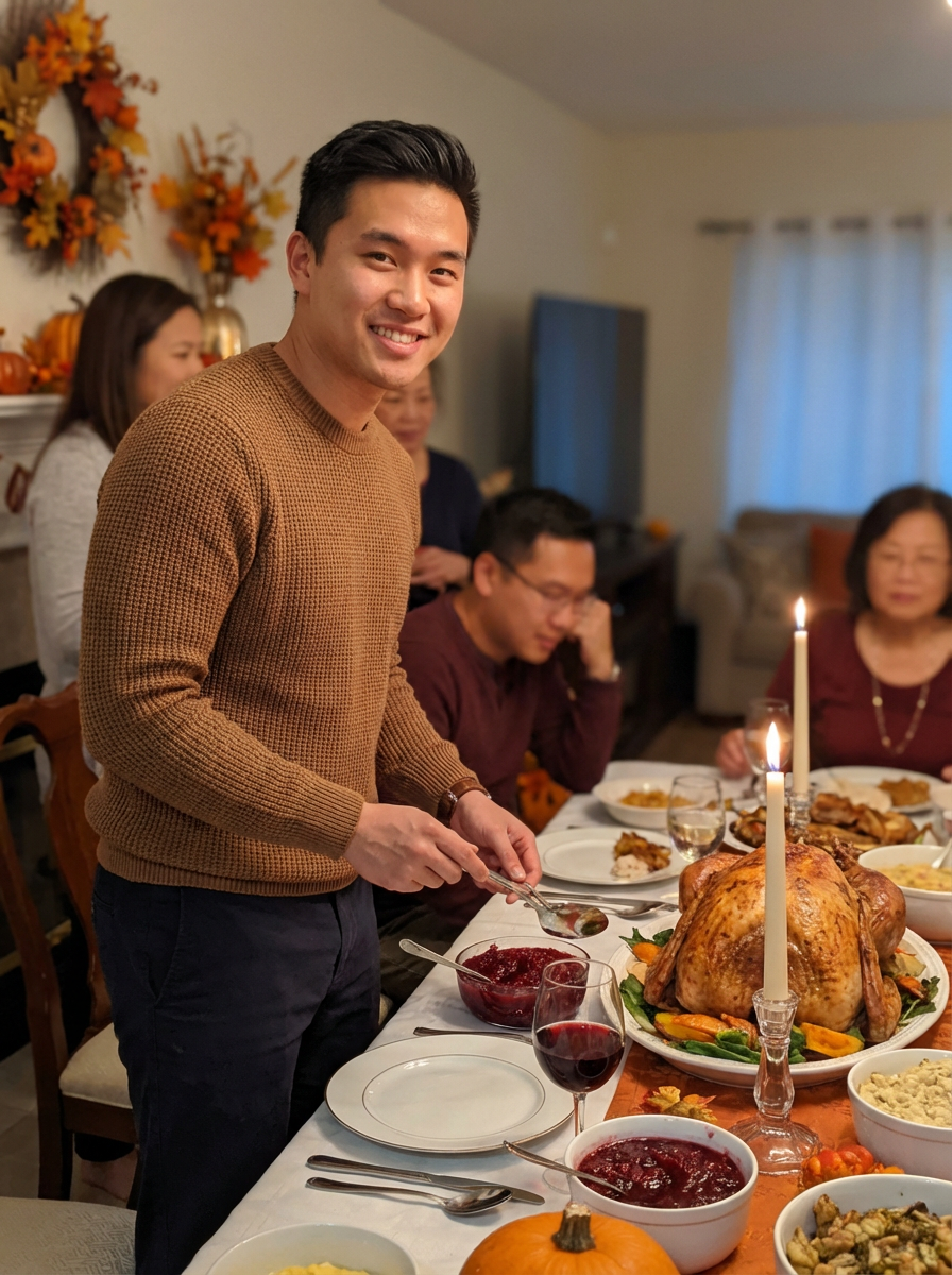 model at Thanksgiving dinner table, beautiful turkey centerpiece, warm candlelight, cozy fall outfit, family gathering atmosphere