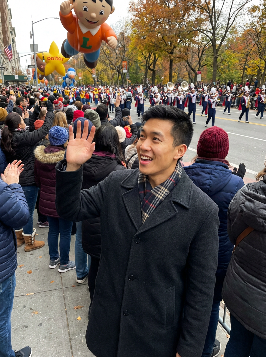 model at Thanksgiving parade, festive crowd, warm coat and scarf, excited expression