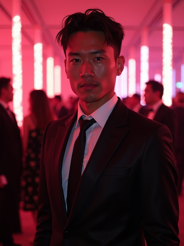 model at the exclusive Met Gala after-party in the museum's modern wing, wearing a modern interpretation of black tie with unexpected details, celebrity DJs and dance floor with spectacular lighting effects