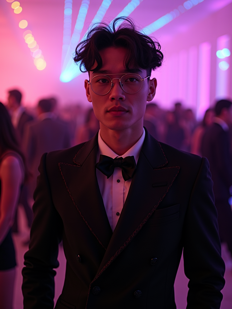 model at the exclusive Met Gala after-party in the museum's modern wing, wearing a modern interpretation of black tie with unexpected details, celebrity DJs and dance floor with spectacular lighting effects