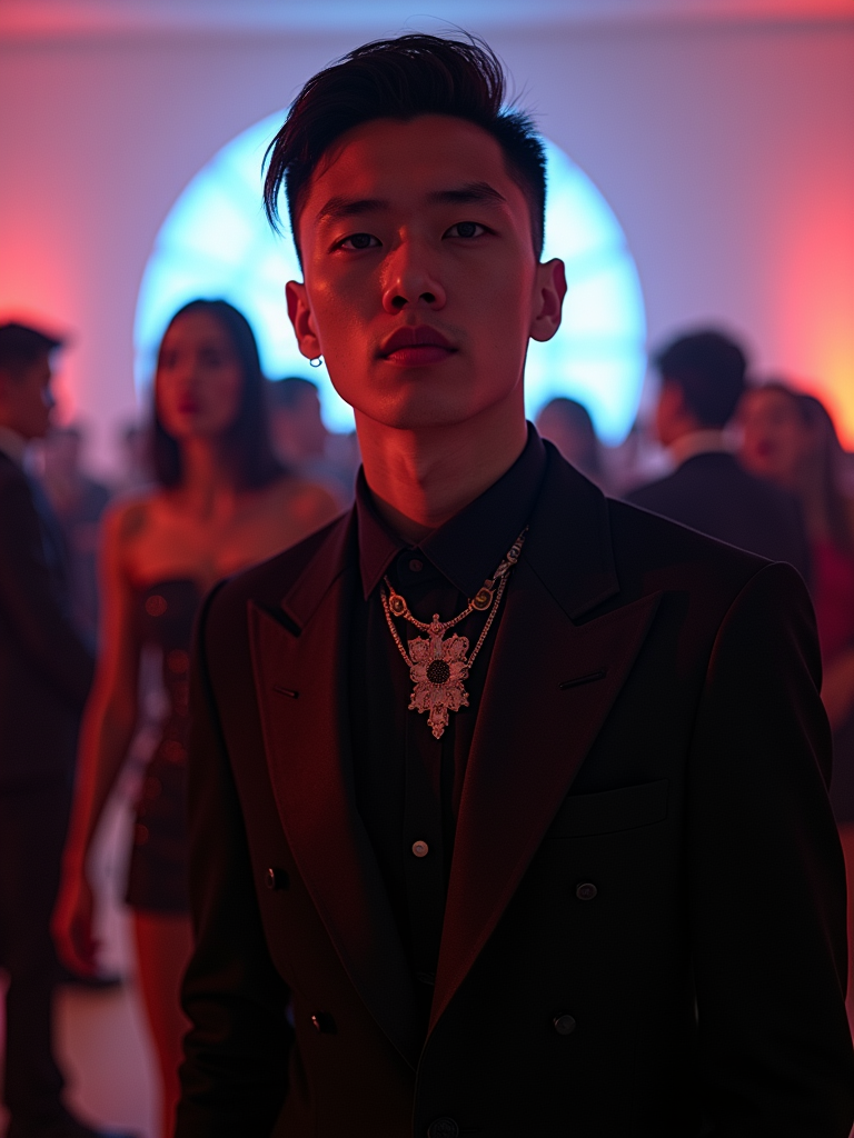 model at the exclusive Met Gala after-party in the museum's modern wing, wearing a modern interpretation of black tie with unexpected details, celebrity DJs and dance floor with spectacular lighting effects