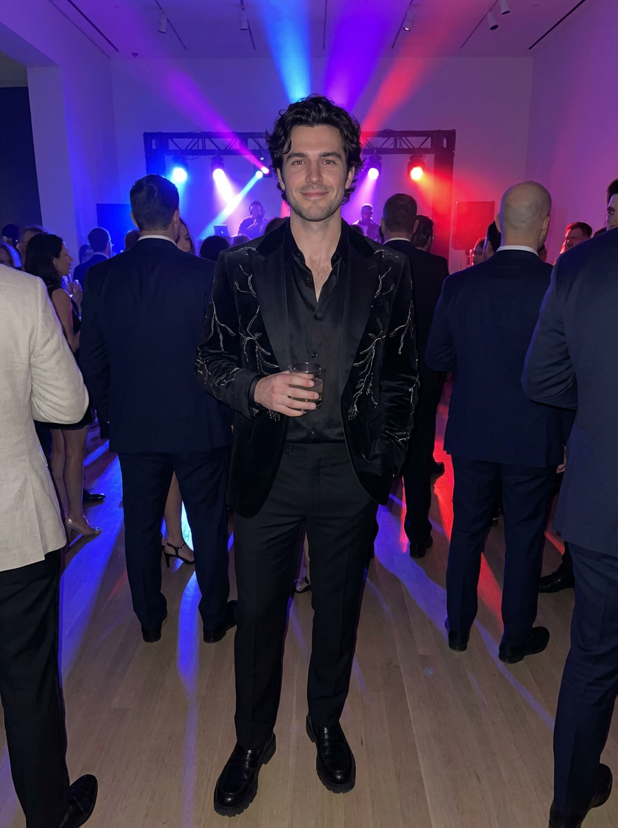 model at the exclusive Met Gala after-party in the museum's modern wing, wearing a modern interpretation of black tie with unexpected details, celebrity DJs and dance floor with spectacular lighting effects