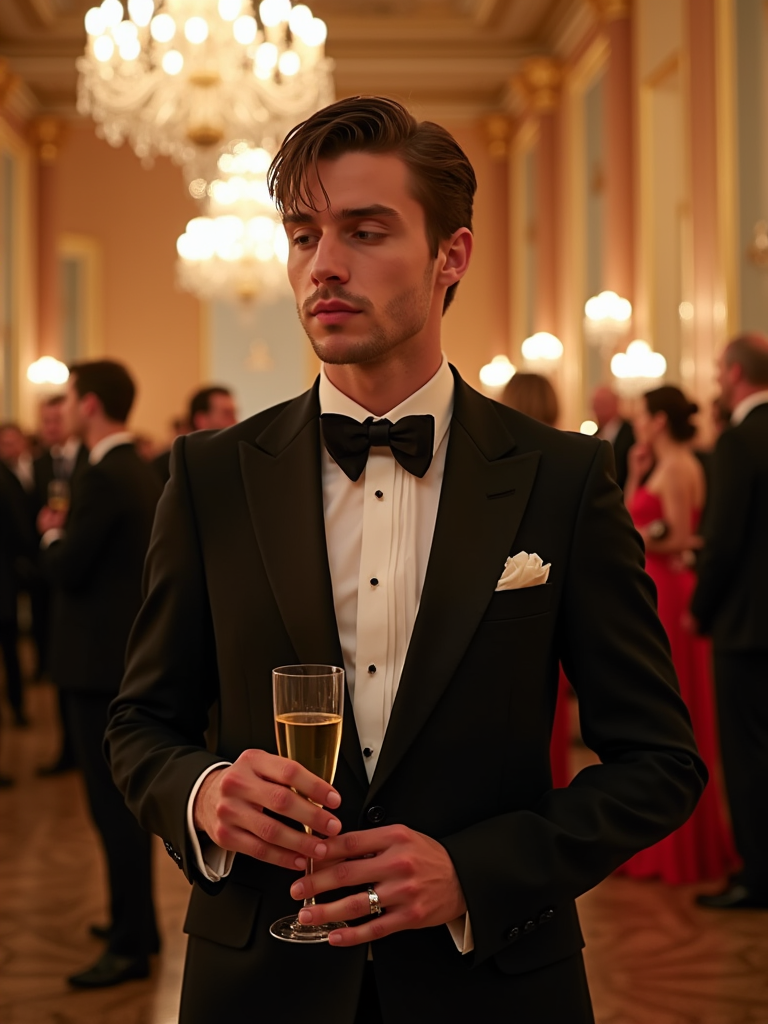 model at the exclusive Met Gala cocktail hour in the museum's Great Hall, wearing a cutting-edge designer suit with artistic flair, champagne flutes and elaborate event décor with this year's theme