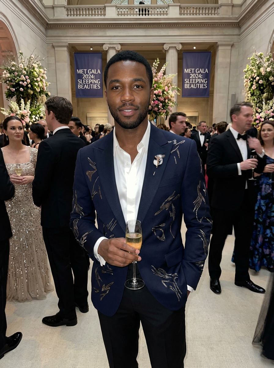 model at the exclusive Met Gala cocktail hour in the museum's Great Hall, wearing a cutting-edge designer suit with artistic flair, champagne flutes and elaborate event décor with this year's theme