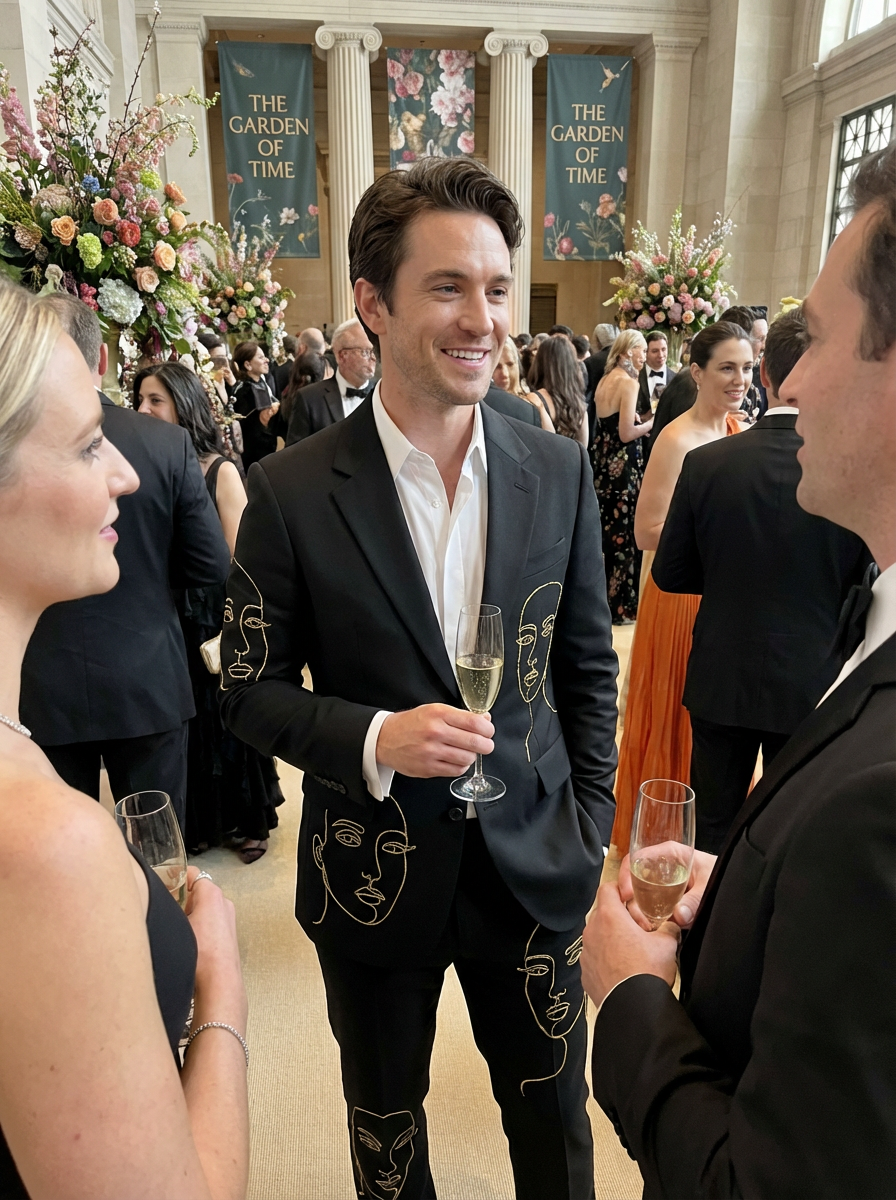 model at the exclusive Met Gala cocktail hour in the museum's Great Hall, wearing a cutting-edge designer suit with artistic flair, champagne flutes and elaborate event décor with this year's theme