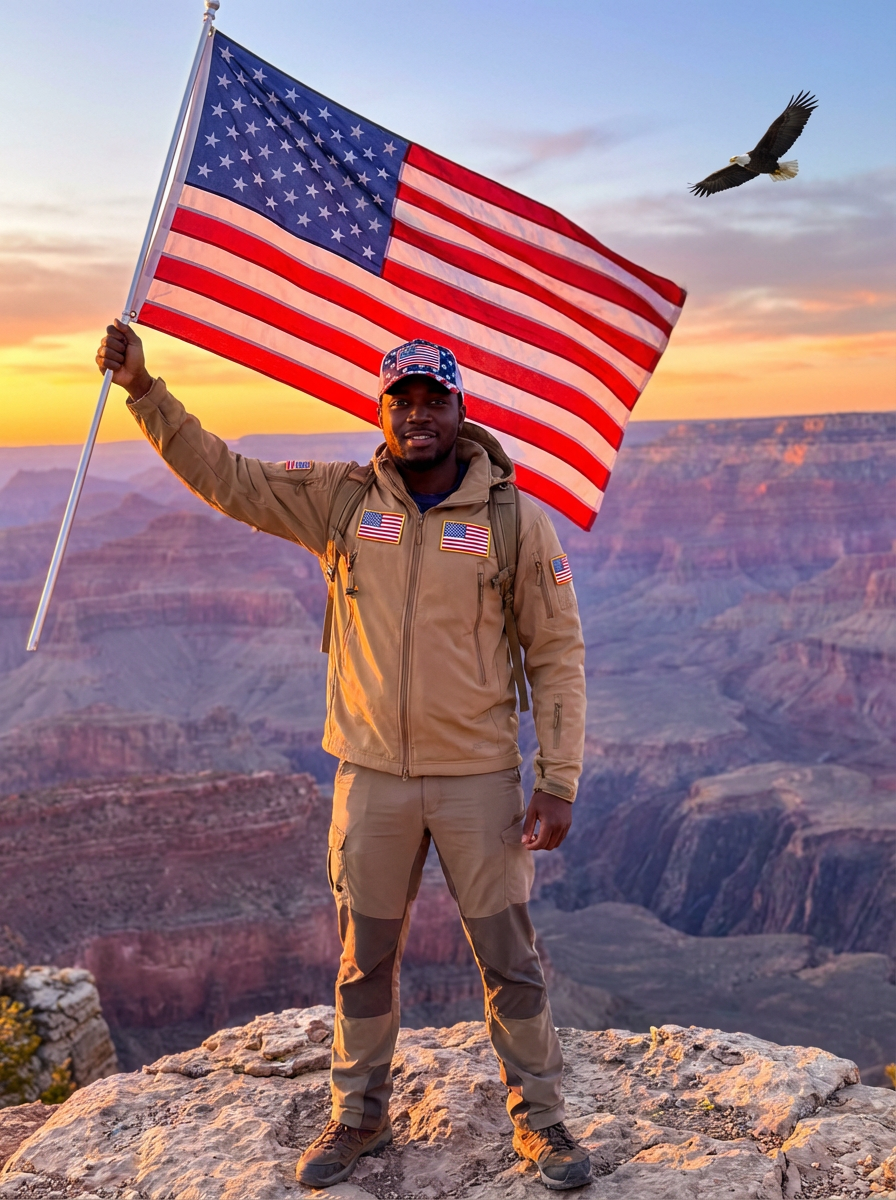 model at the Grand Canyon at sunset, wearing outdoor gear with American flag patches and a patriotic hat, proudly holding the American flag high, the majestic natural wonder stretching behind, bald eagle soaring overhead
