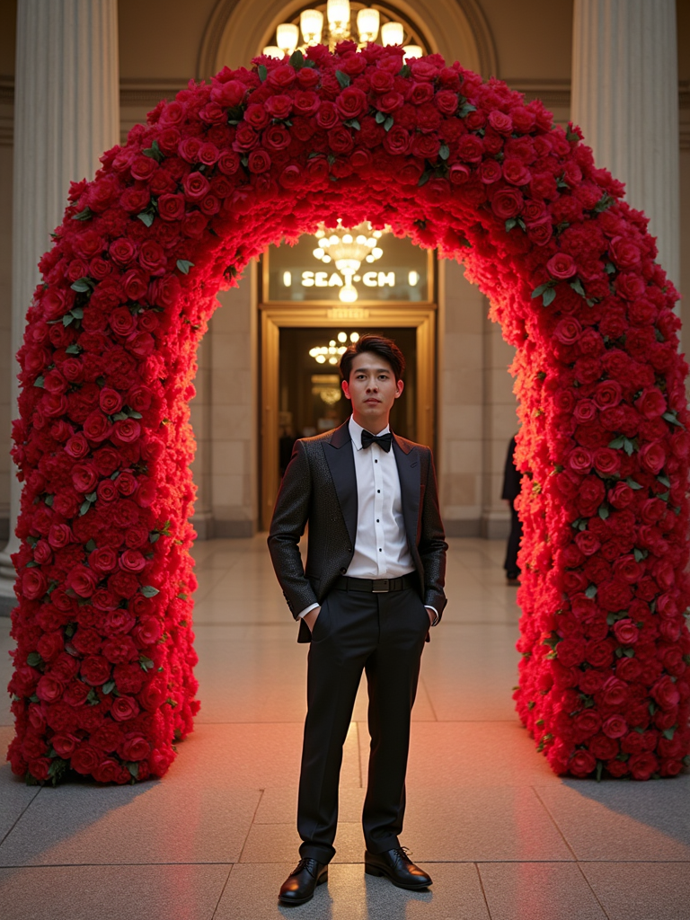 model at the Met Gala entrance with the famous flower-adorned archway, wearing a boundary-pushing formal ensemble with statement accessories, Metropolitan Museum façade illuminated with special event lighting