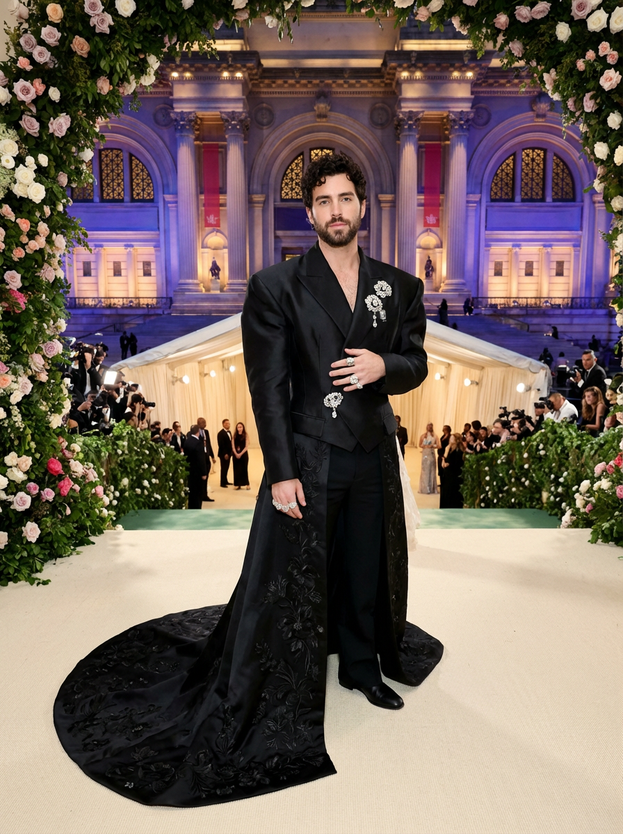 model at the Met Gala entrance with the famous flower-adorned archway, wearing a boundary-pushing formal ensemble with statement accessories, Metropolitan Museum façade illuminated with special event lighting