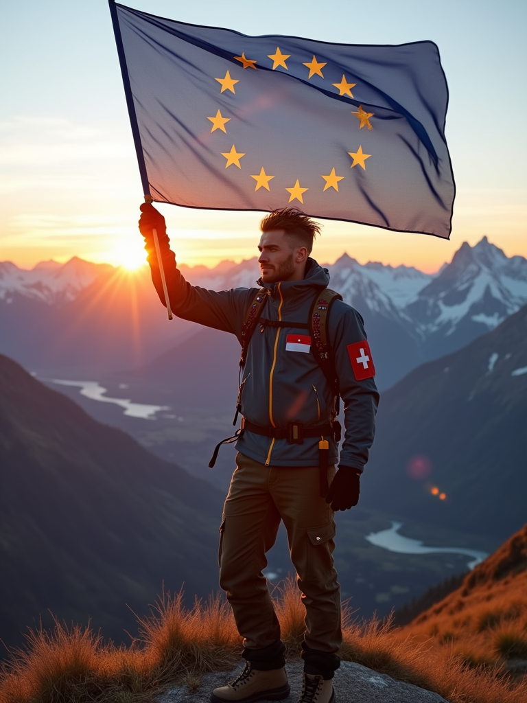model at the Swiss Alps at sunset, wearing outdoor gear with European flag patches, proudly holding a European flag high, the majestic mountains stretching behind