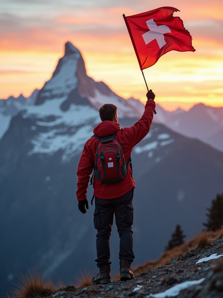 model at the Swiss Alps at sunset, wearing outdoor gear with European flag patches, proudly holding a European flag high, the majestic mountains stretching behind