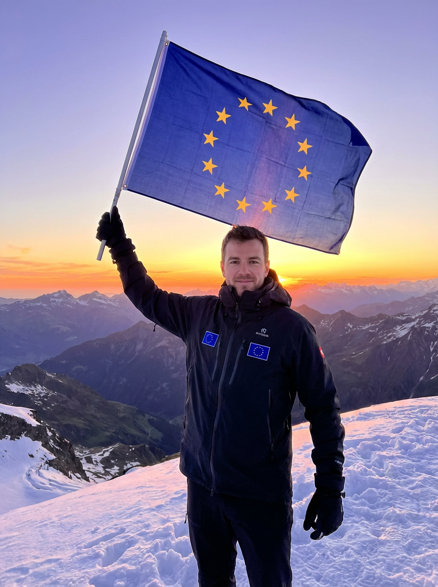 model at the Swiss Alps at sunset, wearing outdoor gear with European flag patches, proudly holding a European flag high, the majestic mountains stretching behind