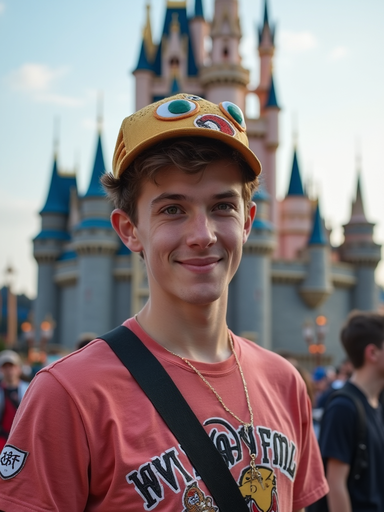 model at Tokyo DisneySea, wearing casual Disney fan wear with character hat, castle in background
