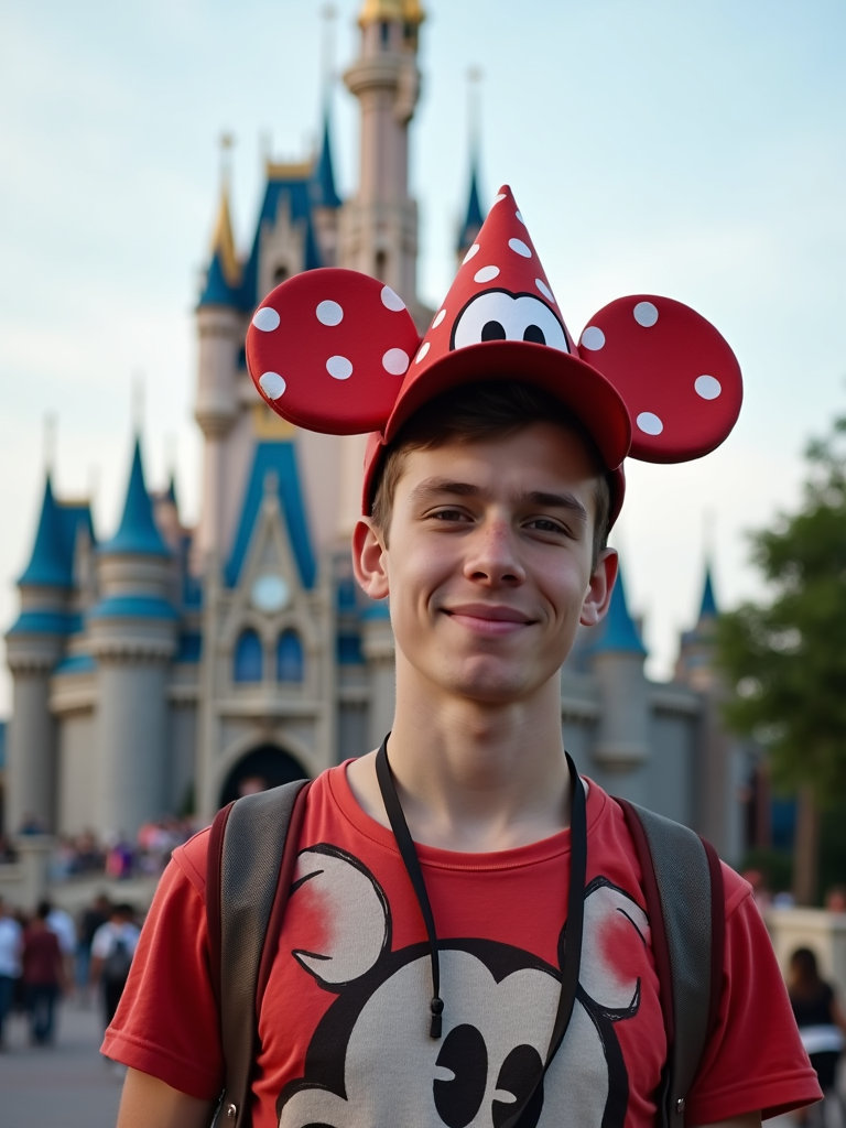 model at Tokyo DisneySea, wearing casual Disney fan wear with character hat, castle in background