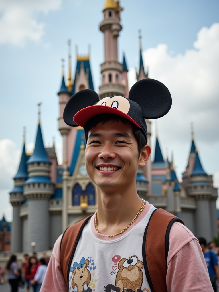 model at Tokyo DisneySea, wearing casual Disney fan wear with character hat, castle in background