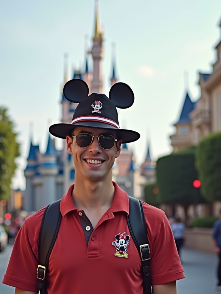 model at Tokyo DisneySea, wearing casual Disney fan wear with character hat, castle in background