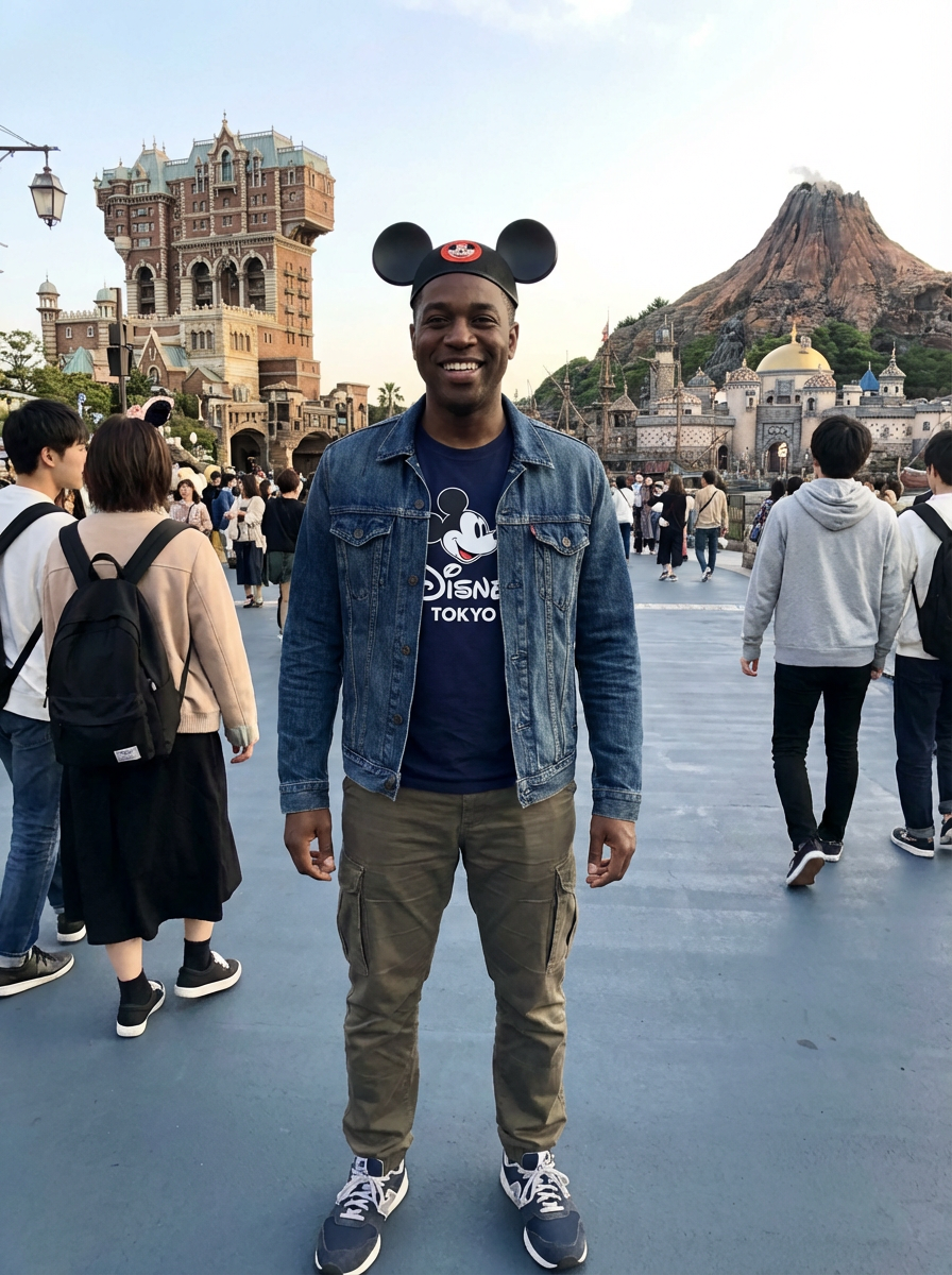 model at Tokyo DisneySea, wearing casual Disney fan wear with character hat, castle in background