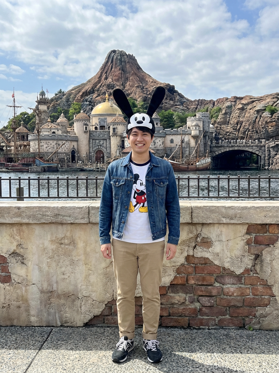 model at Tokyo DisneySea, wearing casual Disney fan wear with character hat, castle in background