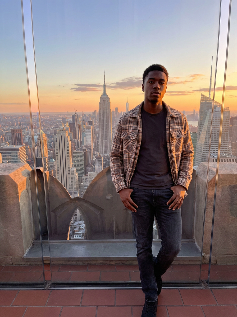 model at Top of the Rock, observation deck, NYC panorama behind, sunset golden hour