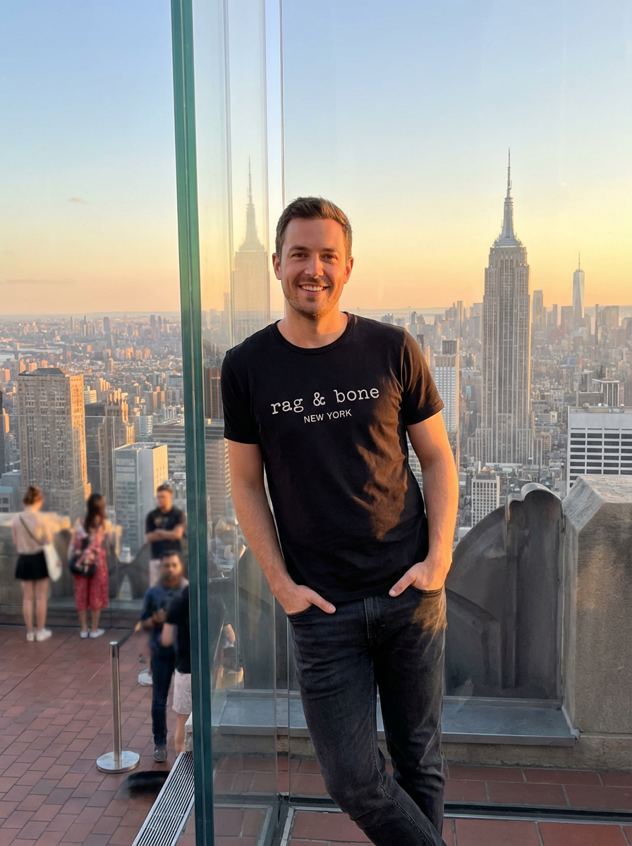 model at Top of the Rock, observation deck, NYC panorama behind, sunset golden hour