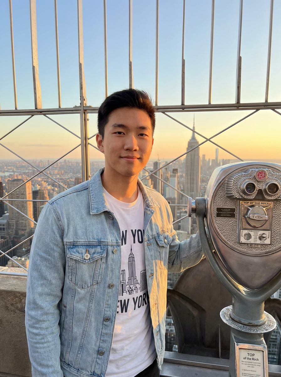 model at Top of the Rock, observation deck, NYC panorama behind, sunset golden hour