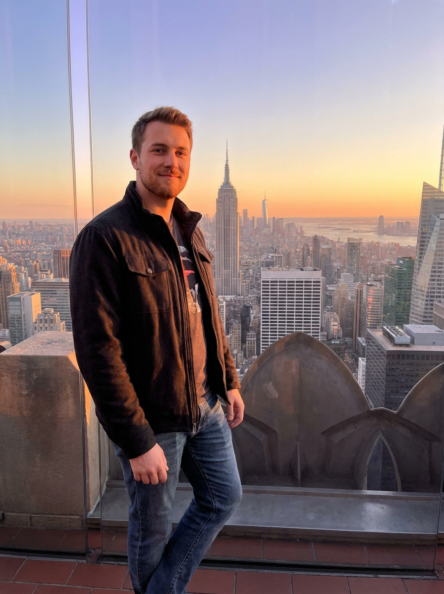 model at Top of the Rock, observation deck, NYC panorama behind, sunset golden hour