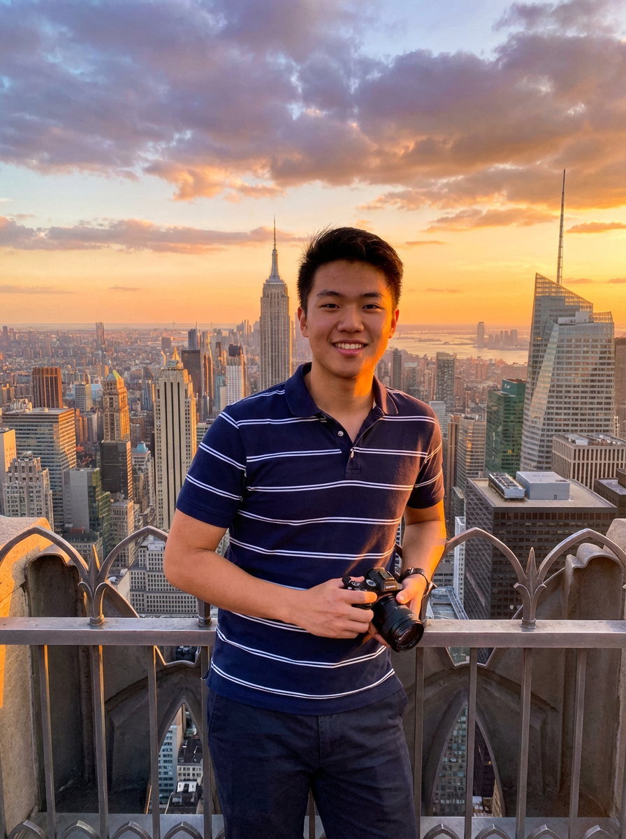 model at Top of the Rock, observation deck, NYC panorama behind, sunset golden hour