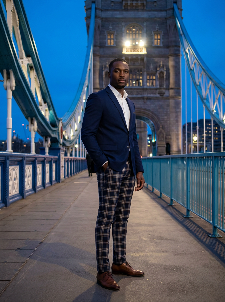model at Tower Bridge London, dramatic architecture, stylish outfit, blue hour lighting