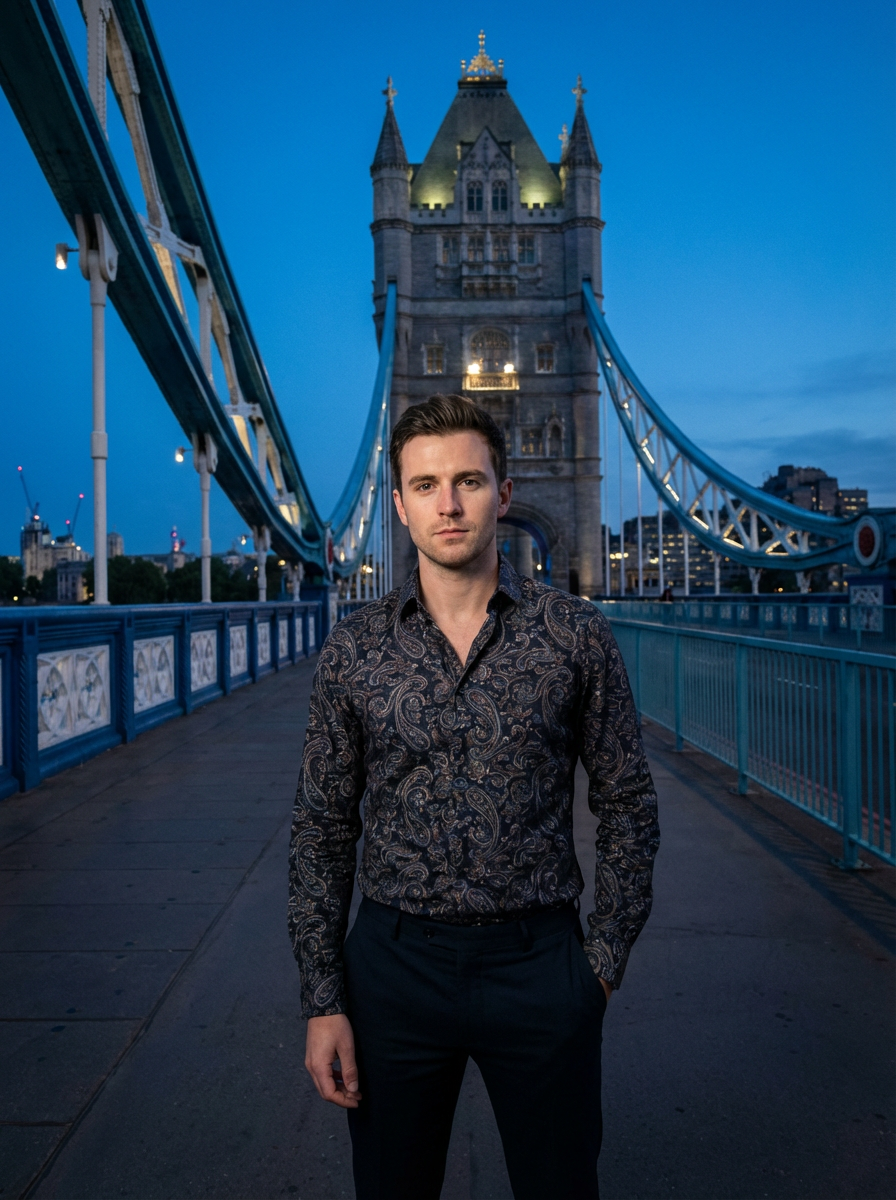 model at Tower Bridge London, dramatic architecture, stylish outfit, blue hour lighting