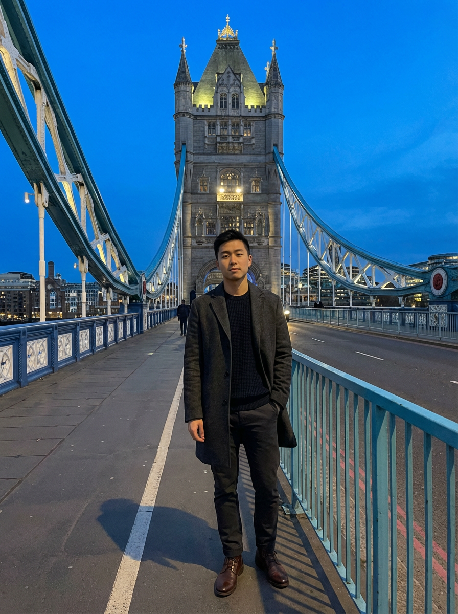 model at Tower Bridge London, dramatic architecture, stylish outfit, blue hour lighting