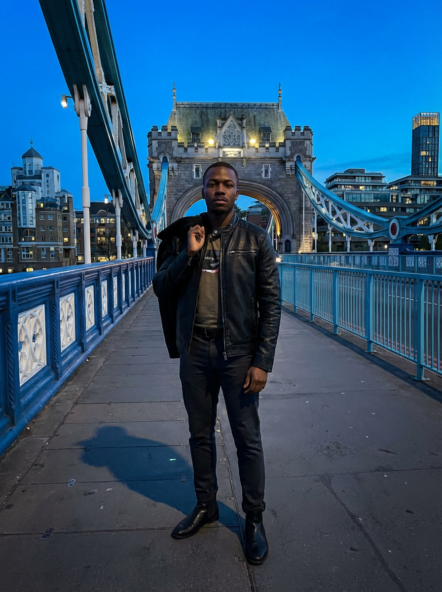 model at Tower Bridge London, dramatic architecture, stylish outfit, blue hour lighting