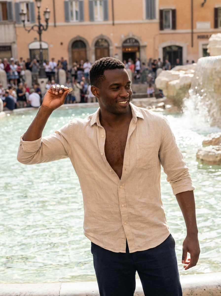 model at Trevi Fountain, throwing coin tradition, linen shirt, romantic scene
