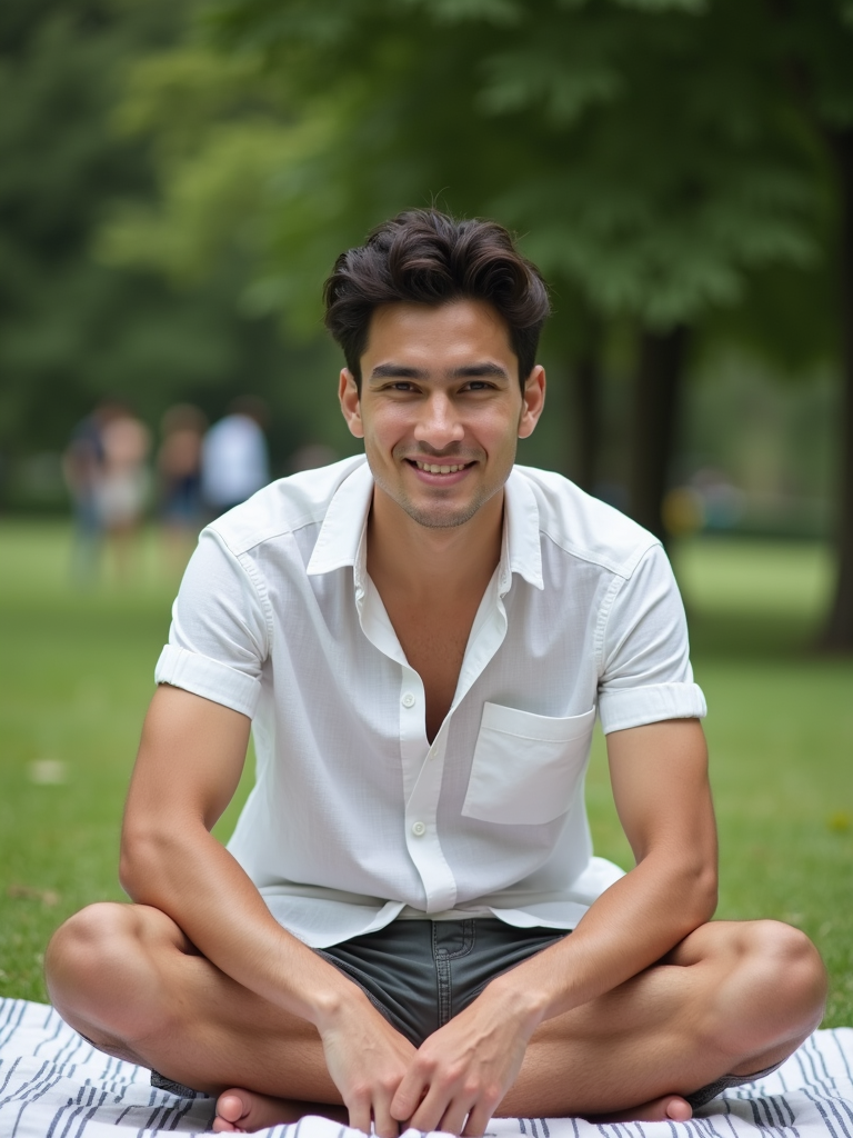 model at Tuileries Garden picnic, wearing bermuda shorts with a linen shirt, sitting on picnic blanket