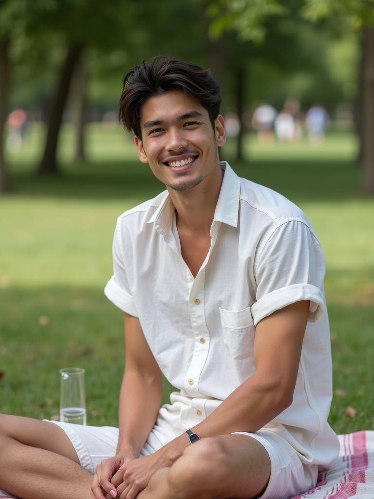 model at Tuileries Garden picnic, wearing bermuda shorts with a linen shirt, sitting on picnic blanket