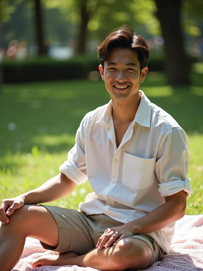 model at Tuileries Garden picnic, wearing bermuda shorts with a linen shirt, sitting on picnic blanket