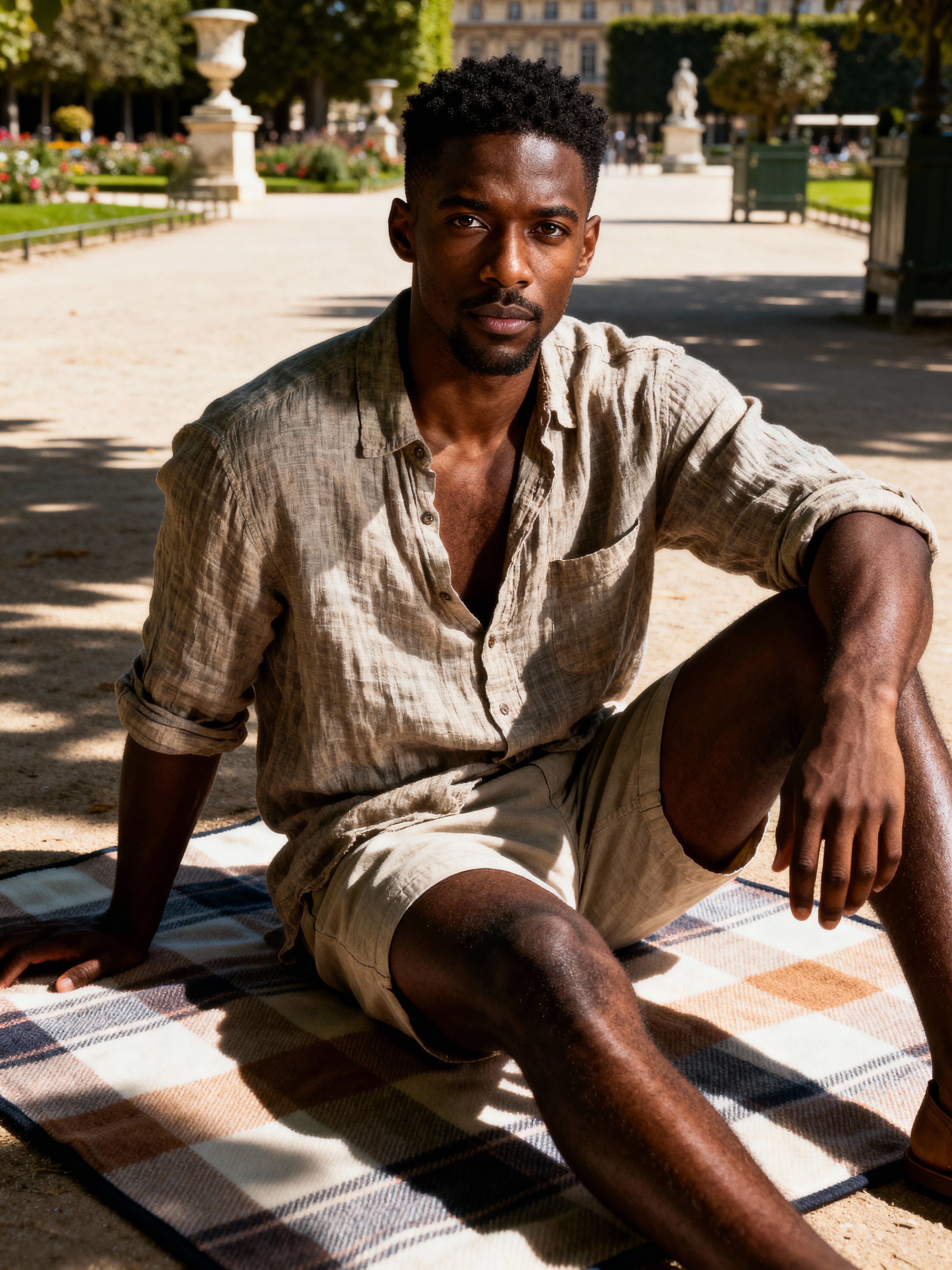 model at Tuileries Garden picnic, wearing bermuda shorts with a linen shirt, sitting on picnic blanket