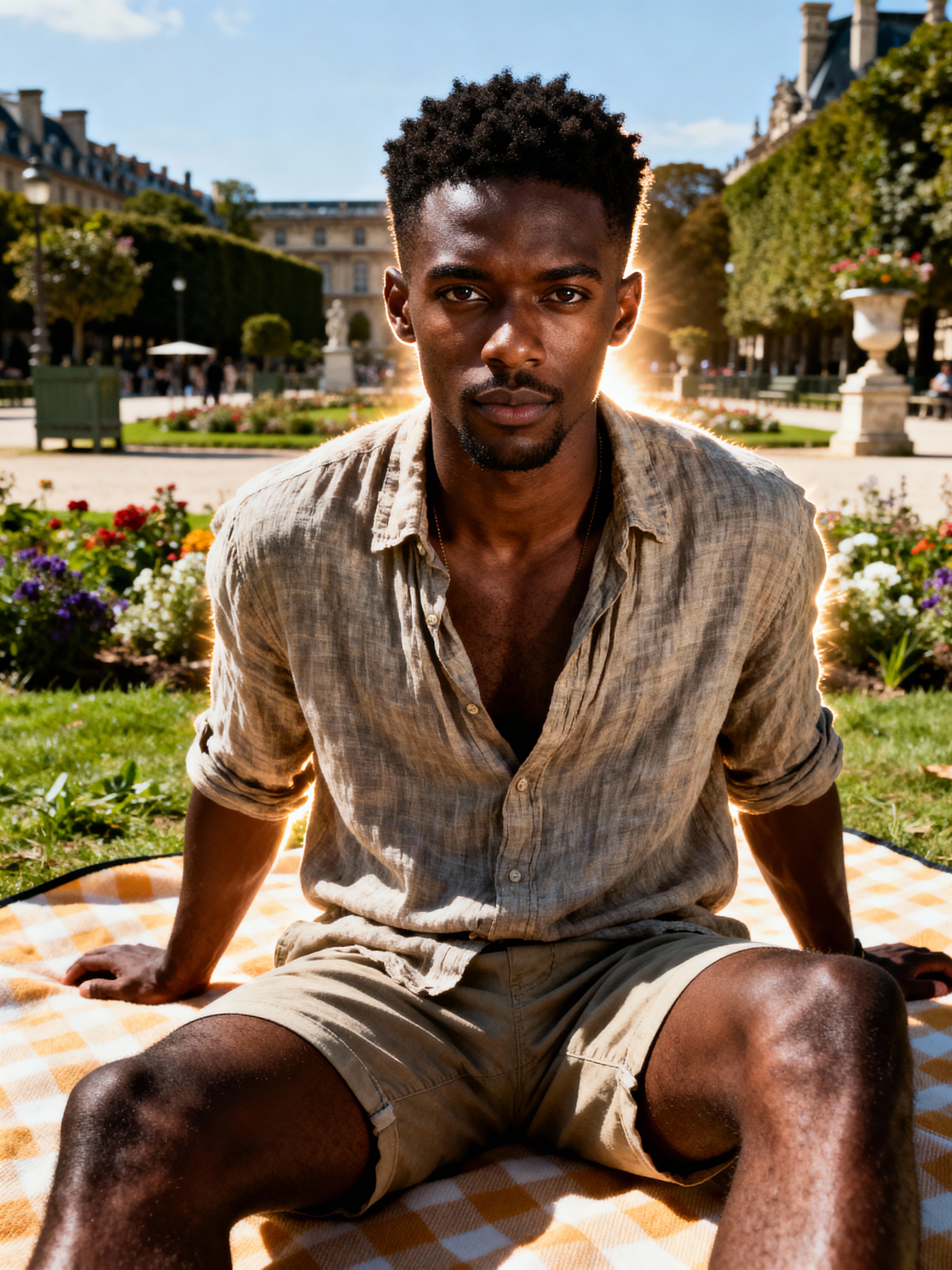 model at Tuileries Garden picnic, wearing bermuda shorts with a linen shirt, sitting on picnic blanket