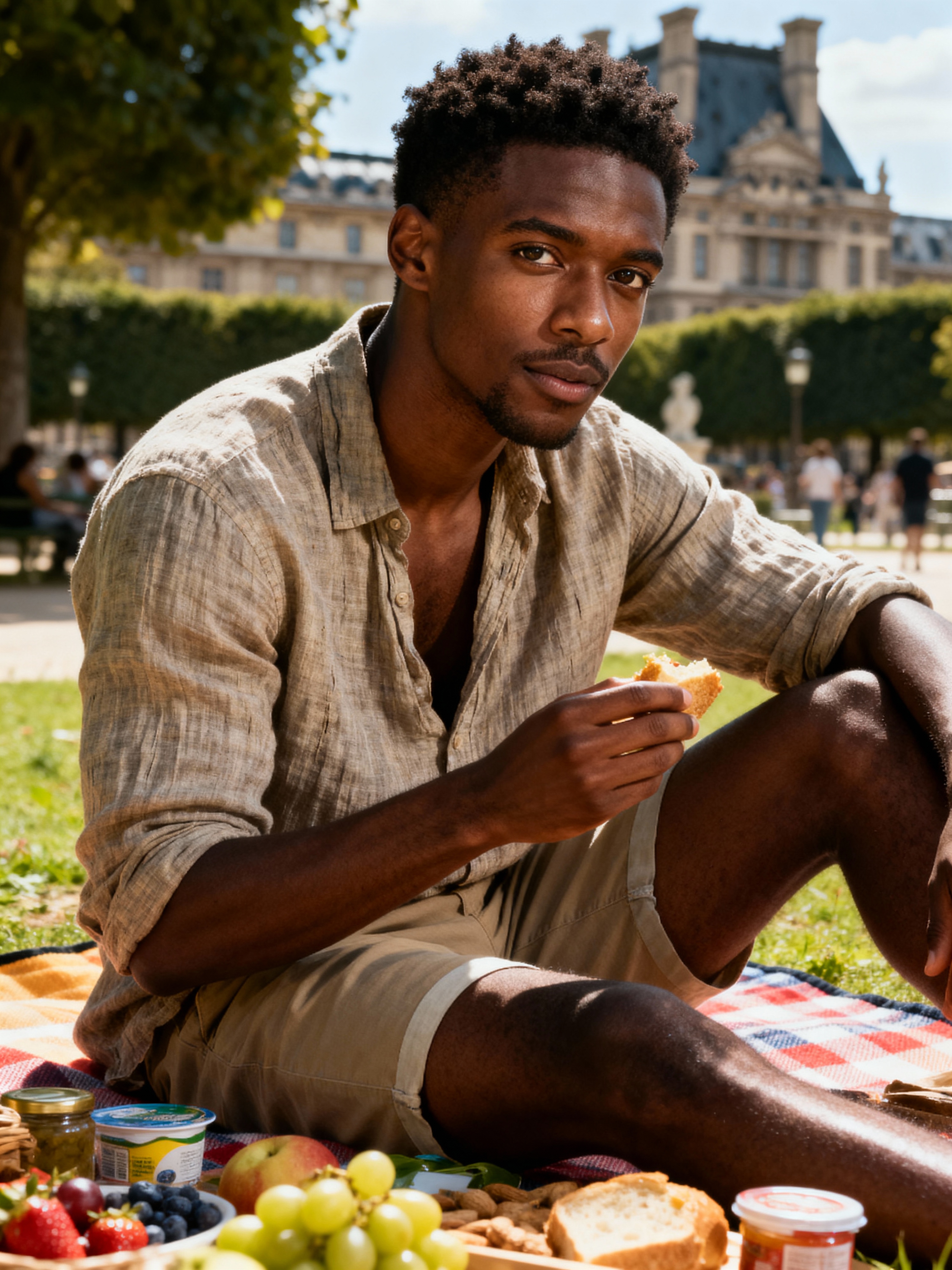model at Tuileries Garden picnic, wearing bermuda shorts with a linen shirt, sitting on picnic blanket